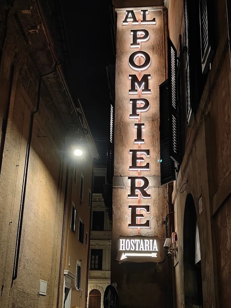 Calda atmosfera e calorosa accoglienza nel ristorante Al Pompiere situato nel ghetto ebraico e gestito dal 1928 dalla famiglia Monteferri. Volte affrescate, pavimenti in cotto, marmi d'epoca e ampie vetrate affacciate sul teatro naturale di Piazza delle Cinque Scole, nel seicentesco palazzo di Beatrice Cenci. Noto a Roma, in Italia e all'estero per i famosi carciofi alla Giudia, fiori di zucca e filetti di baccalà, offre piatti tipici della cucina romana come tonnarelli cacio e pepe, spaghetti alla carbonara, bucatini all'amatriciana, tonnarelli con carciofi, trippa, coda, animelle, saltimbocca e altro.